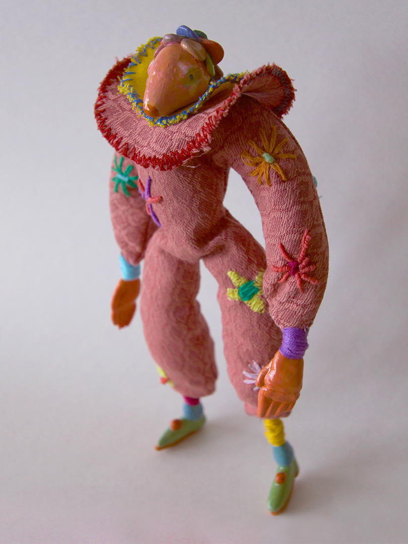 The puppets are made with polymer clay, acrylic paint, fabric, thread and have a metal wireframe. The illustrations are made with pencil and colored digitally.